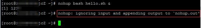 在命令头尾分别加上nohup和&,可以看到nohup输出了一行信息,再Enter键就跳回了Shell命令行,此时命令已经在后台执行了,nohup将命令的输出重定向至当前目录的nohup.out文件中。同时,nohup会将对应程序的PID输出,PID可用于需要中断进程时结束进程